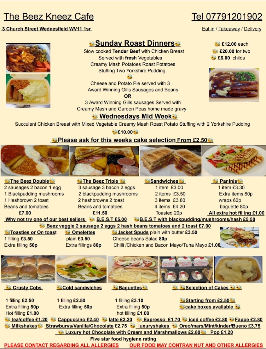 The menu at Beez Kneez Cafe offers a variety of options suitable for breakfast, light meals, and casual dining throughout the day. Visitors can choose from a range of beverages including traditional and specialty coffees such as latte, cappuccino, espresso, double espresso, frappé, iced coffee, and hot chocolate. Luxury milkshakes and canned drinks are also available.