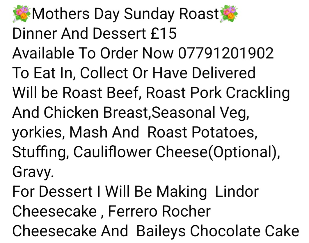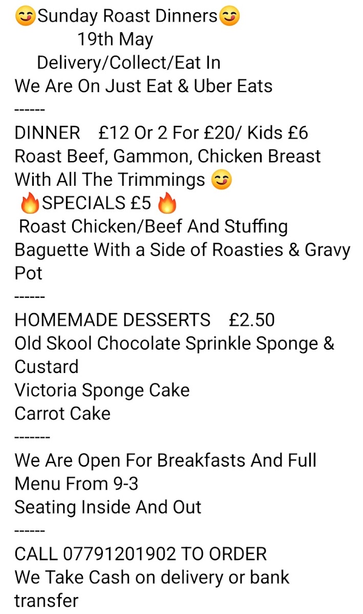 Food selections include classic breakfast dishes like sausage, egg, chips, and beans, as well as sandwiches and sliders, which provide convenient options for quick meals. The menu also features traditional Sunday dinners for more substantial dining occasions.