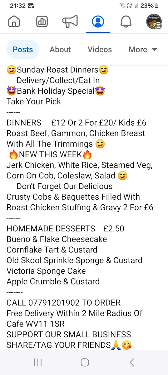 For those with a sweet tooth, the cafe offers homemade desserts such as old skool chocolate sprinkle sponge with custard, Victoria sponge cake, carrot cake, and cornflake tart served with custard. Additionally, a variety of cakes, scones served with clotted cream and strawberry jam, and a cake selection complement the coffee and tea offerings, making the menu well-suited for coffee breaks and light refreshments.